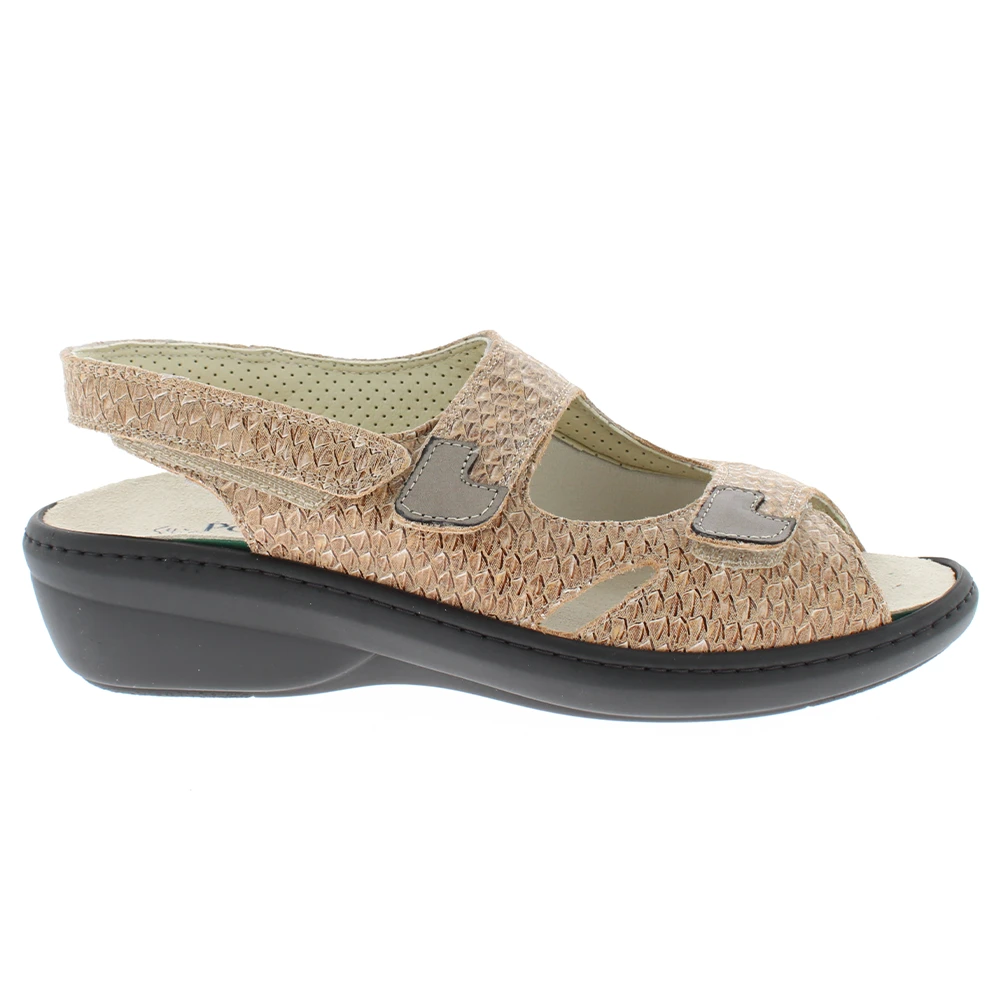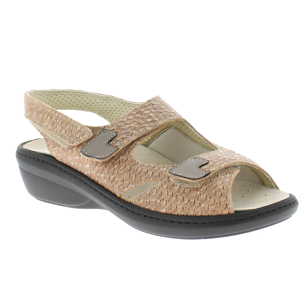 La sandale orthopédique Podowell Dina02 pour femme, en coloris sable et cuir écaille, offre un ajustement personnalisable avec trois brides auto-agrippantes. Elle est conçue pour le confort des pieds sensibles avec un intérieur souple et extensible, une semelle légère antidérapante renforcée par une couture pour la durabilité. Idéale pour les déformations de l’avant du pied et les porteurs de semelles sur mesure, elle assure une protection des orteils sans compression et un maintien sécurisé du talon avec une semelle intérieure remplaçable pour un confort optimal tout au long de la journée.