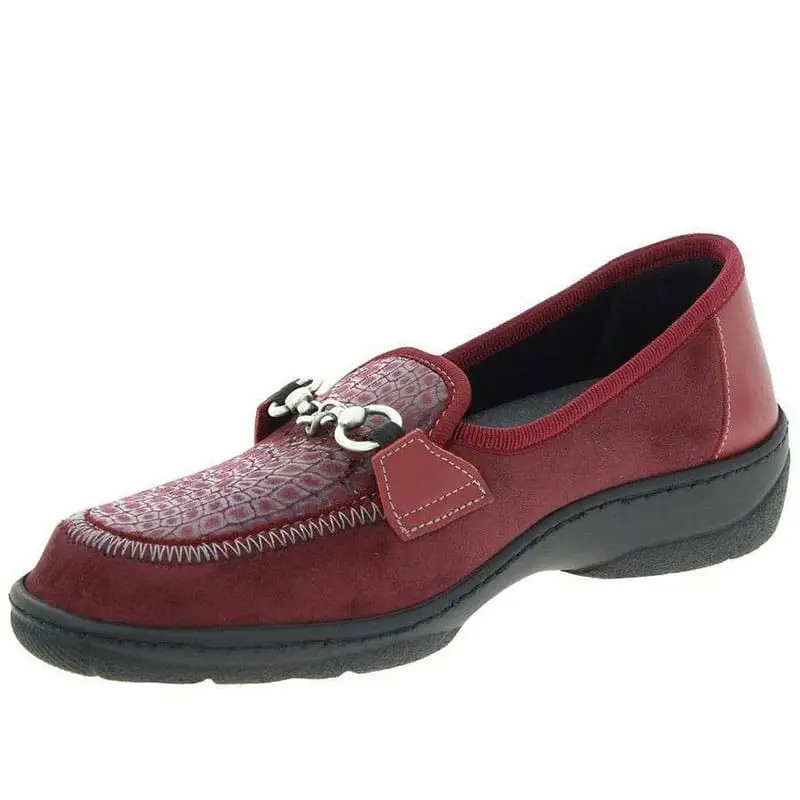 Cette chaussure confort pour femme est disponible en couleur bordeaux et de la pointure 36 à 42.