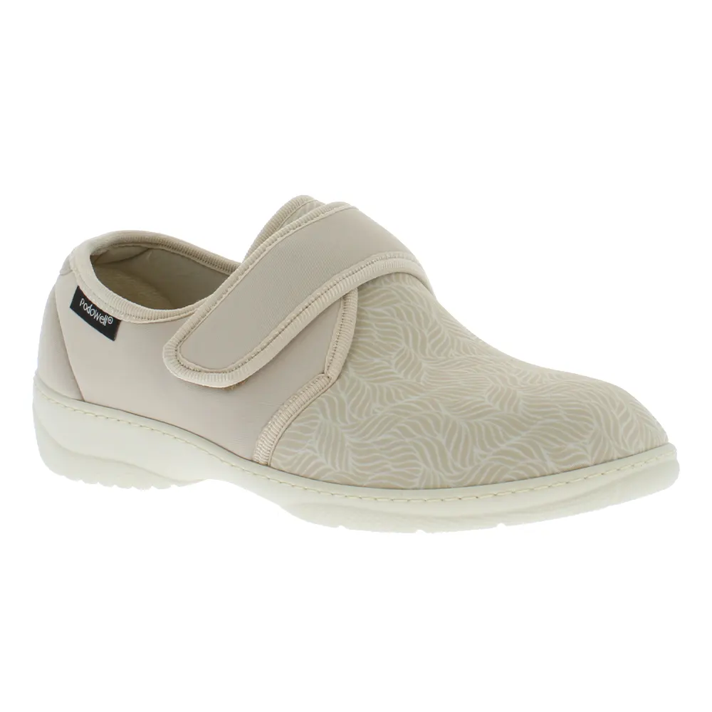 Cette chaussure orthopédique pour femme est disponible en couleur sable et de la pointure 36 à 42.