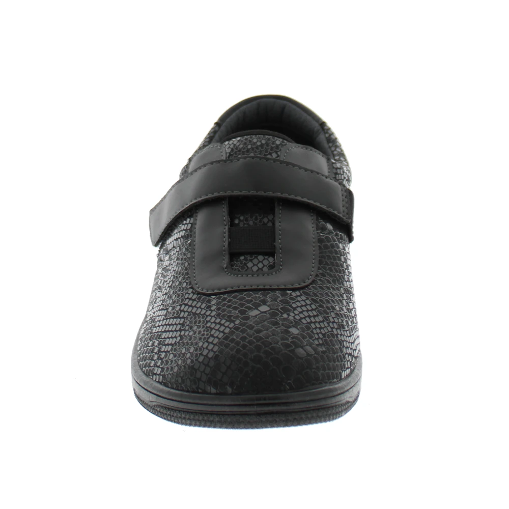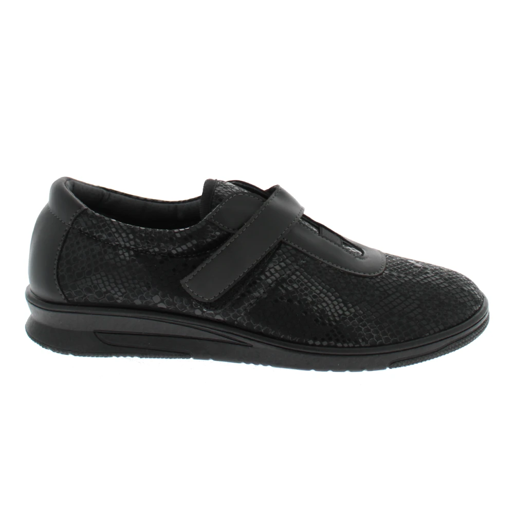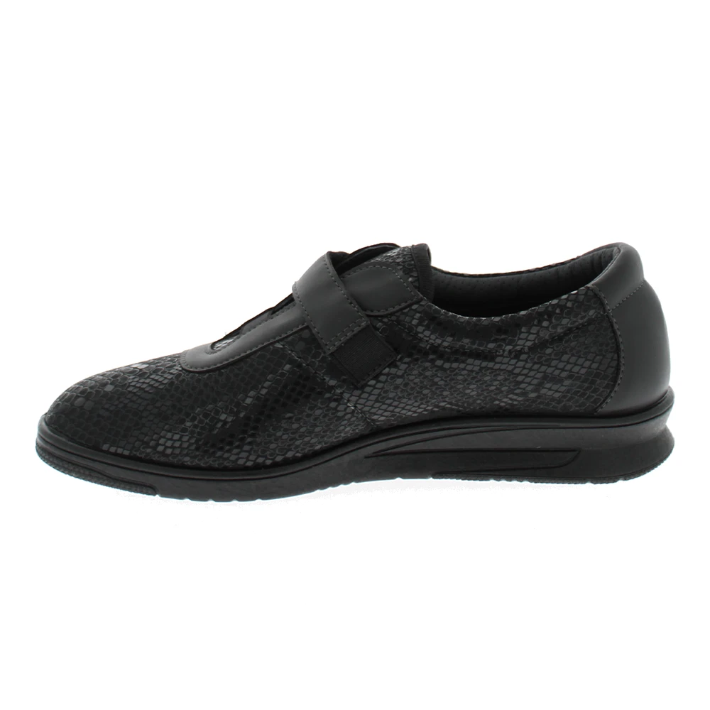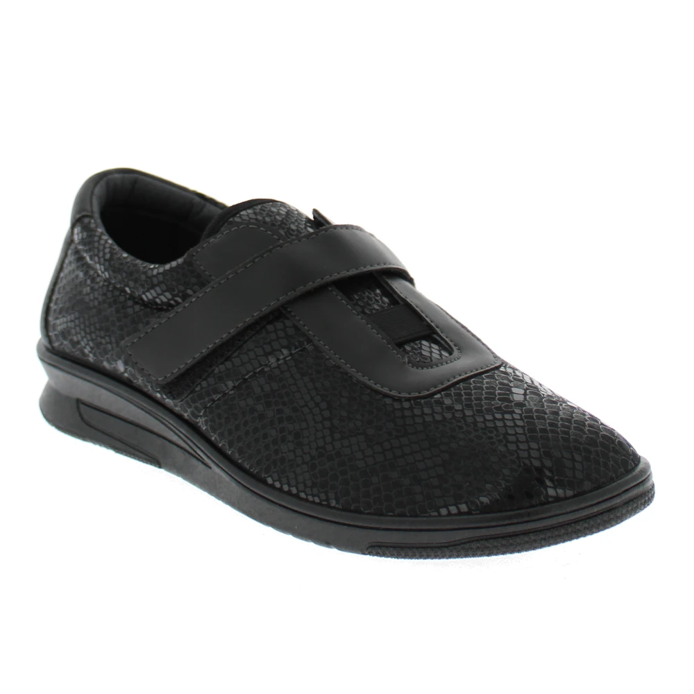 Cette chaussure orthopédique pour femme est disponible en couleur noir et de la pointure 36 à 42.