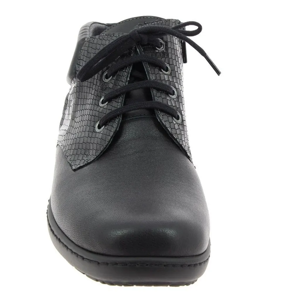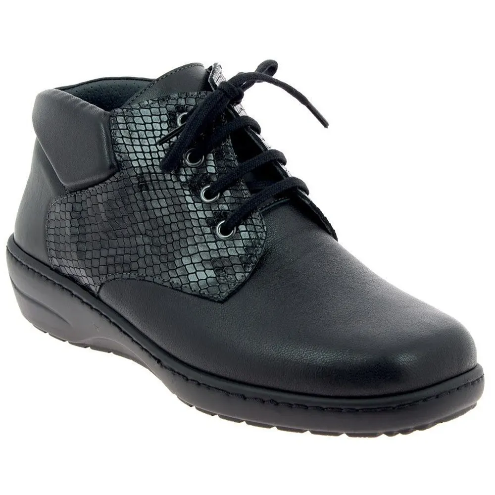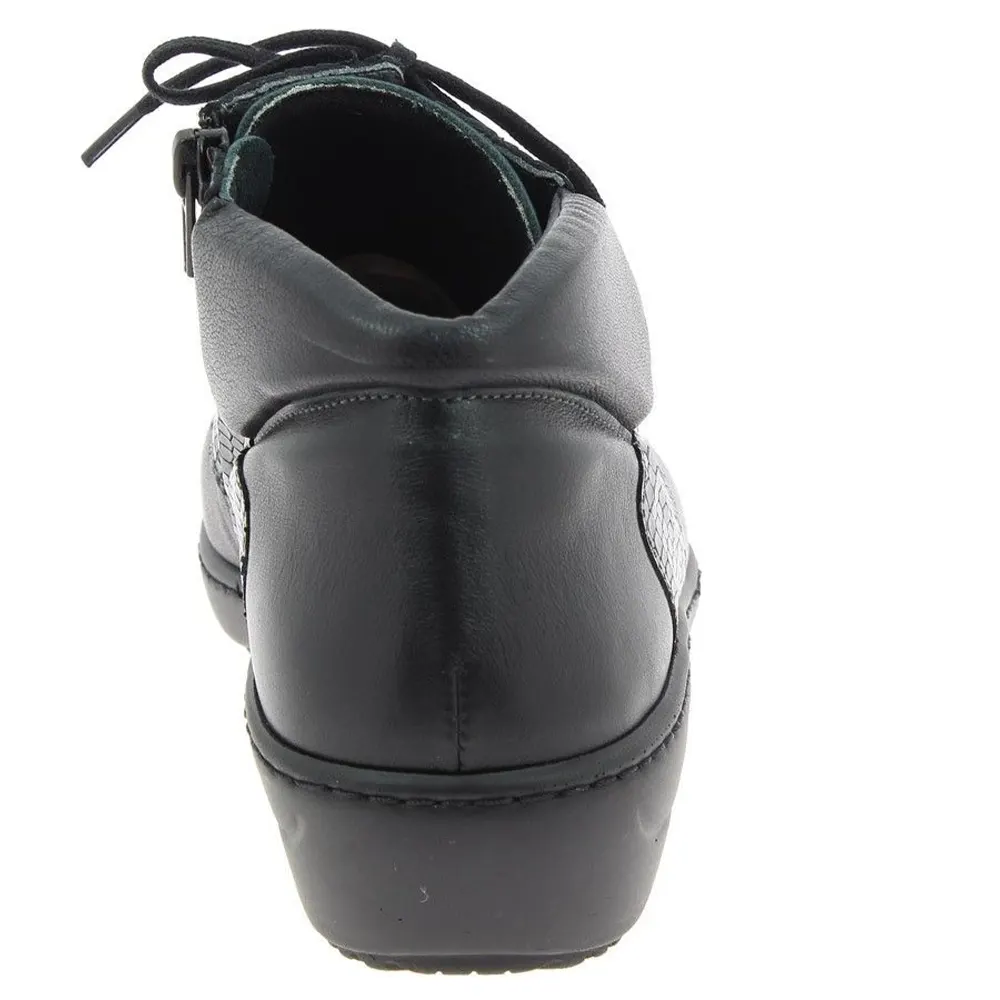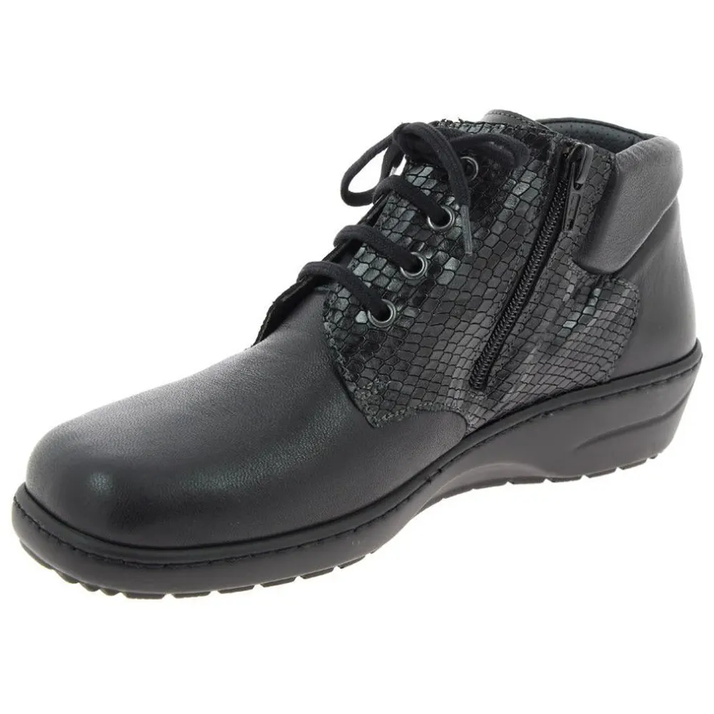 La bottine Solane est un bottillon très féminin et ultra confortable. Les lacets sont associés à un zip, ce qui permet un réglage précis. L’avant-pied en cuir stretch s’adapte à la morphologie du pied. Le col matelassé au niveau de la cheville apporte un grand confort. Le volume chaussant est modulable grâce à une semelle intérieure et un intercalaire amovibles. La semelle extérieure Wetgrip est anti-dérapante et offre une grande stabilité.