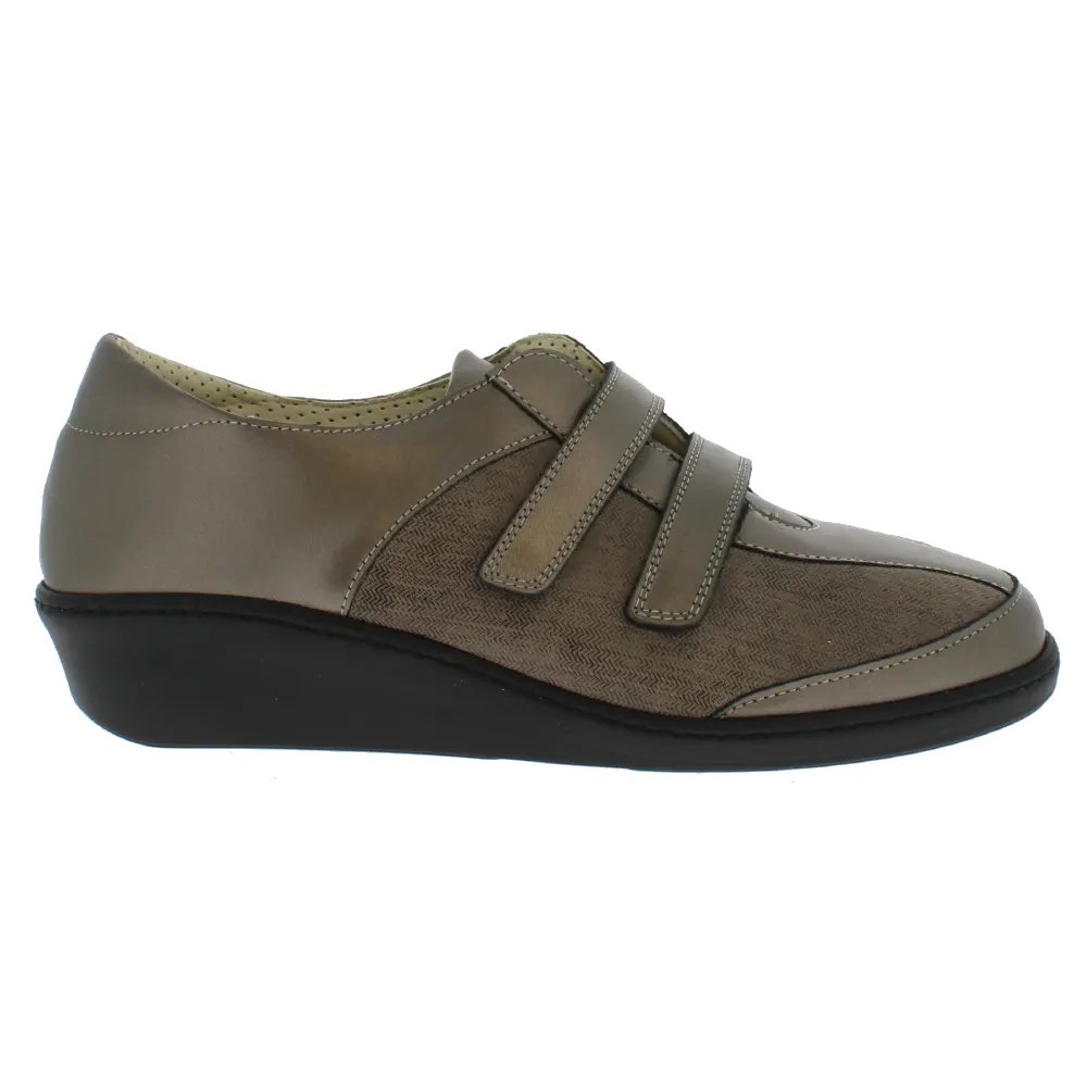 La Stina Bronze de Podowell est une chaussure de ville respirante dotée de deux zones latérales entièrement extensibles pour s’adapter aux pieds souffrant d’hallux-valgus ou de quintus varus. Les deux brides assurent une grande ouverture de la chaussure, facilitant ainsi le chaussage et l’ajustement de la chaussure au pied. La semelle grande stabilité de cette chaussure hallux valgus offre une zone de contact au sol importante, une souplesse de l’avant-pied et un bon maintien lors de la marche.