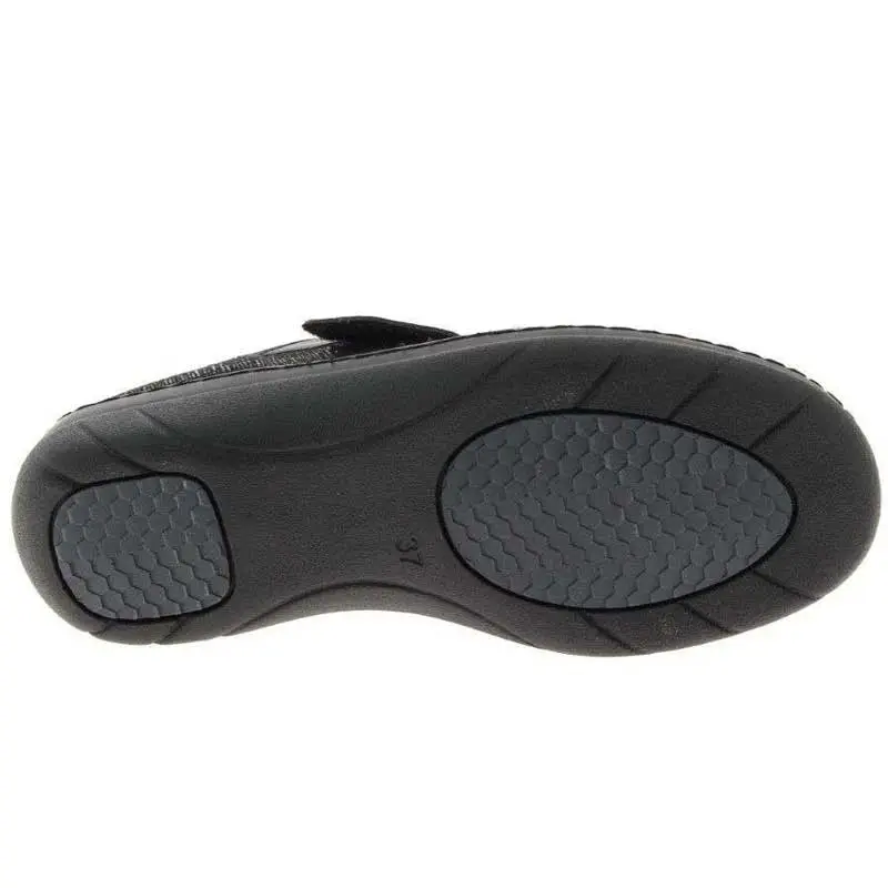 Cette chaussure confort pour femme est disponible en couleur noir et de la pointure 35 à 42.